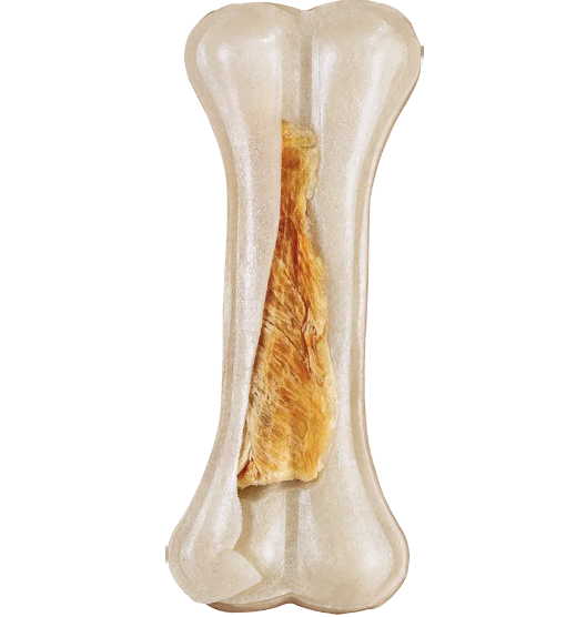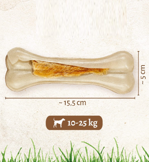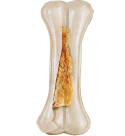 Recompensa sub forma de os, fabricat din piele de vită și piept de pui delicios.