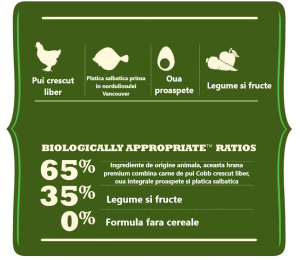Compozitie:Carne de pui proaspata (16%), pui deshidratat (15%), curcan deshidratat (14%), linte rosie, mazare verde integrala, organe proaspete de pui (ficat, inima, rinichi) (4%), hering deshidratat (4%), fibre de mazare, oua proaspete integrale (4%), platica proaspata integrala (4%), ulei de hering (2%), trifoi uscat (2%), fasole fava (2%), linte verde, mazare galbena integrala, grasime de pui (1%), cartilaj proaspat de pui (1%), varec brun deshidratat, dovlecel integral proaspat, dovleac integral proaspat, pastarnac proaspat integral, nap proaspat integral, spanac proaspat, mustar proaspat, nap verde integral, morcovi proaspeti integrali, mere red delicious proaspete, pere bartlett proaspete, ficat de pui freeze-dried, ficat de curcan freeze-dried, merisoare integrale proaspete, coacaze integrale proaspete, radacina de cicoare, turmeric, ciulinul laptelui, radacina de brusture, lavanda, radacina de nalba mare, macese. Aditivi: vitamine si minerale premium. Conservant: conservat natural cu vitamina E.