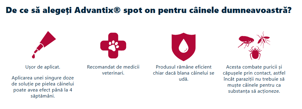 Advantix® Spot-On este o solutie antiparazitara de tip spot-on, aplicata direct pe pielea cainelui. Formula sa unica contine ingrediente active care actioneaza prin contact, fara a fi necesara muscatura pentru ca produsul sa isi faca efectul.
