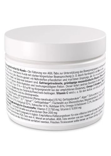 AGIL-Tabs este un supliment alimentar conceput pentru a completa dieta cainilor cu nutrienti din moluste si plante, recunoscuti pentru rolul lor in sustinerea sanatatii tesuturilor conjunctive, cartilajelor si articulatiilor.