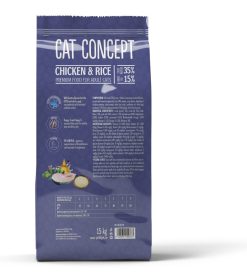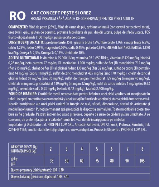 Cat Concept Dry Fish 400g Compoziție: Făină de pește 25%, porumb, făină de pui, grăsimi animale (conservate cu tocoferol), orez (4%), grâu, gluten de porumb, proteine de pui hidrolizate, drojdie uscată, pulpă de sfeclă uscată, ulei de floarea soarelui, ou uscat, FOS fructo-oligozaharide (1000 mg/kg), pulpă de cicoare uscată.