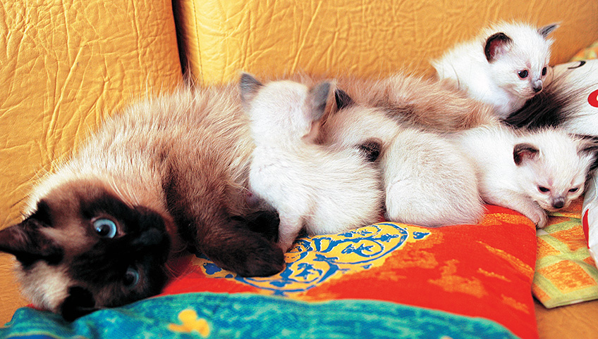 Imediat după naștere, puii sunt linși de către mamă și curățați de învelitorile fetale. Linsul, pe lângă funcția de curățare, are și rolul de a stimula puiul să se trezească și astfel să aibă primul instinct de a găsi mamela. În primele zile după fătare, pisica stă culcată pe o parte, expunându-și astfel mamelele. Suptul inițial constă în colostru, care este similar cu laptele degresat, dar care are un conținut mai mare de anticorpi maternali (imunoglubuline G și A).
