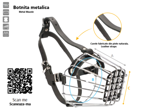 Alegerea botnitei adecvate presupune masurarea lungimii botului ( distanta dintre varful nasului si ochi) si a grosimii (circumferinta) acestuia.