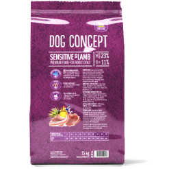 Compoziţie: făină de carne de miel (18%), porumb, tărâțe de porumb, grăsimi de pui (conservate cu un amestec de tocoferoli), mere deshidratate, drojdie de bere,, Manan-oligozaharide (120 mg/kg), Fructo-oligozaharide (80 mg/kg), extract din Yucca schidigera (60 mg/kg).