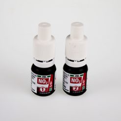– Adaugati 5 picuri din reactivul 1, apoi 5 picuri din reactivul 2 intr-unul din recipiente, astupati si scuturati cu putere, asteptati sa apara culoarea (cca 3 min)