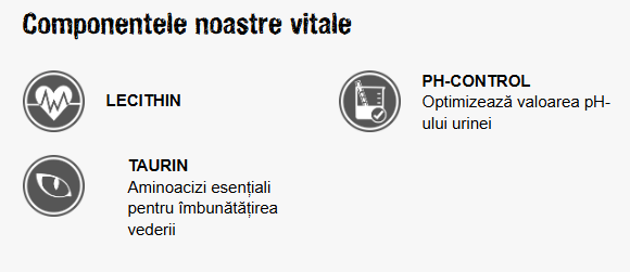 Compozițieproteină de pasăre,nivel scăzut de cenuşă*¹ (33%); porumb; grăsime de pasăre; grâu; făină din pește marin (5%); orez; secară*² (4%); ficat de pasăre*³; ou*¹; drojdii de bere, inactivate*¹ (2,5%); semințe de in (1,1%); clorură de sodiu; clorură de potasiu; inulină din cicoare *¹uscat *²malțificat *³hidrolizat