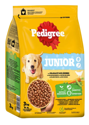 Hrana completă și echilibrată pentru câini juniori de talie medie, Pedigree Junior contribuie la o dezvoltare armonioasă și sănătoasă, fiind potrivită inclusiv pentru cățele gestante sau care alăptează.