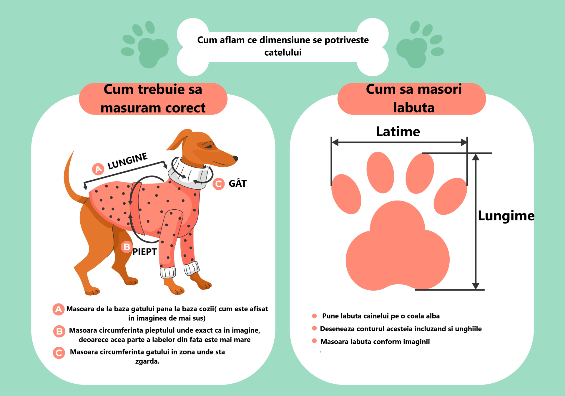 Lungimea este măsurată de la baza gâtului până la începutul cozii. Alege mărimea în funcție de lungimea spatelui câinelui: