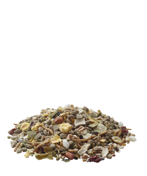 Compoziție: cereale (ovăz 8%), semințe, derivați de origine vegetală, legume (mazăre 10%, păstârnac 2%, praz 1%), extracte din proteine vegetale, fructe (ananas 2%, stafide 2%), insecte (viermi de făină 4%), fructe cu coajă, minerale, ierburi, MOS, FOS, calendula, semințe de struguri